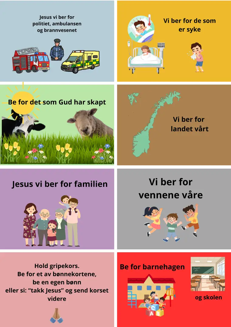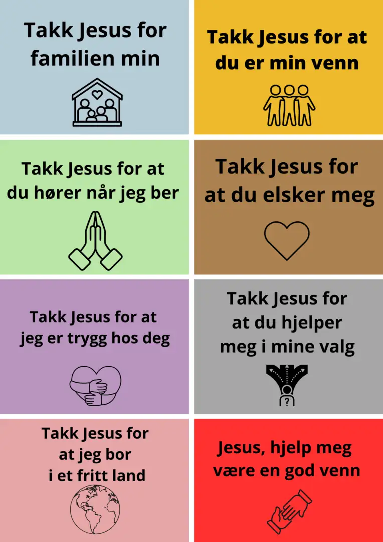Disse bruker jeg i bønnestund eller gruppetid i barnekirka. Klipper de opp og legger de utover på gulvet eller på bordet. Sender rundt et gripekors og gir barna valget mellom å be en av de bønnene som står på kortene, be en egen bønn eller si takk Jesus før de sender korset videre.